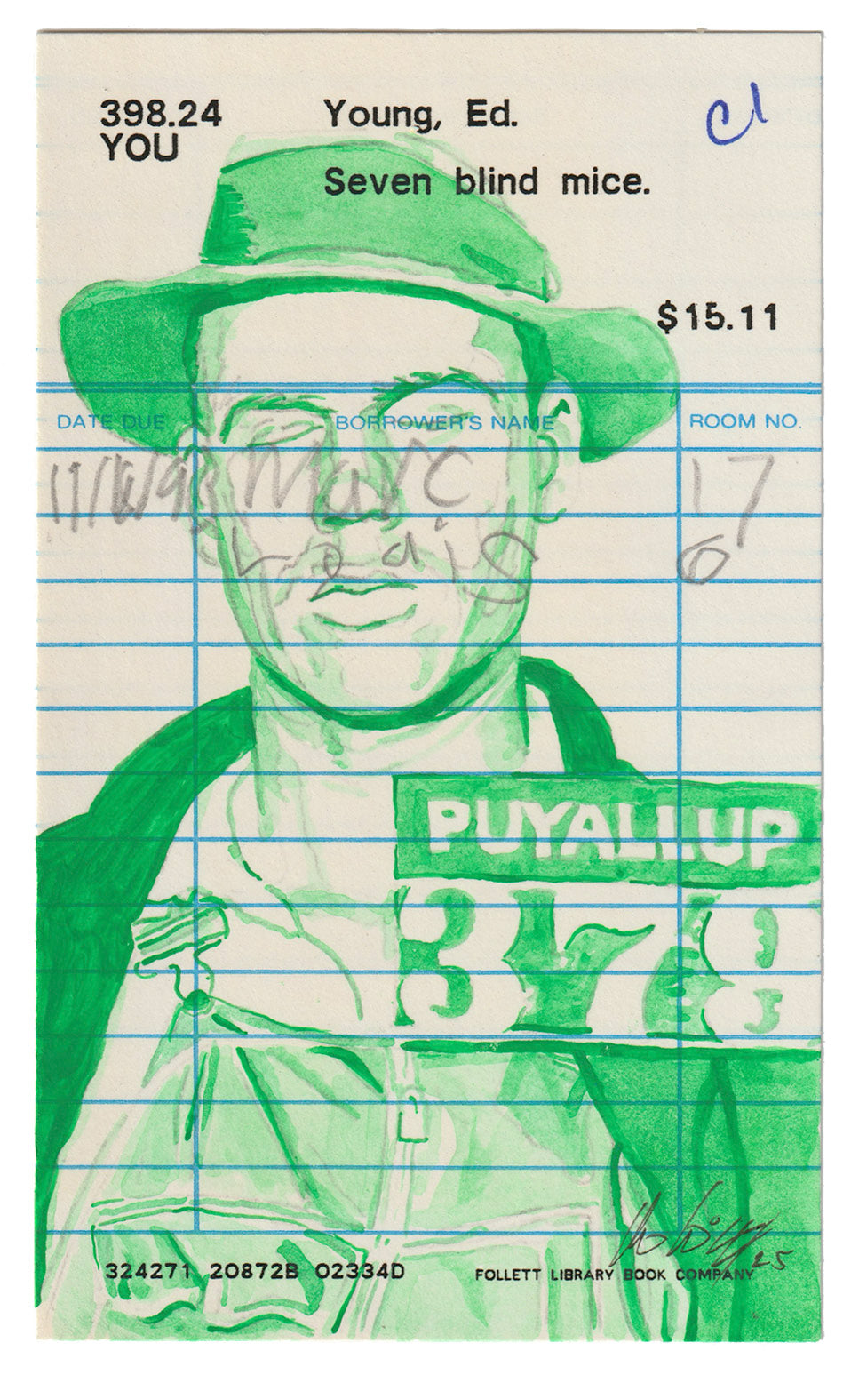 Acrylic on library borrower card, 5" x 3", 2025