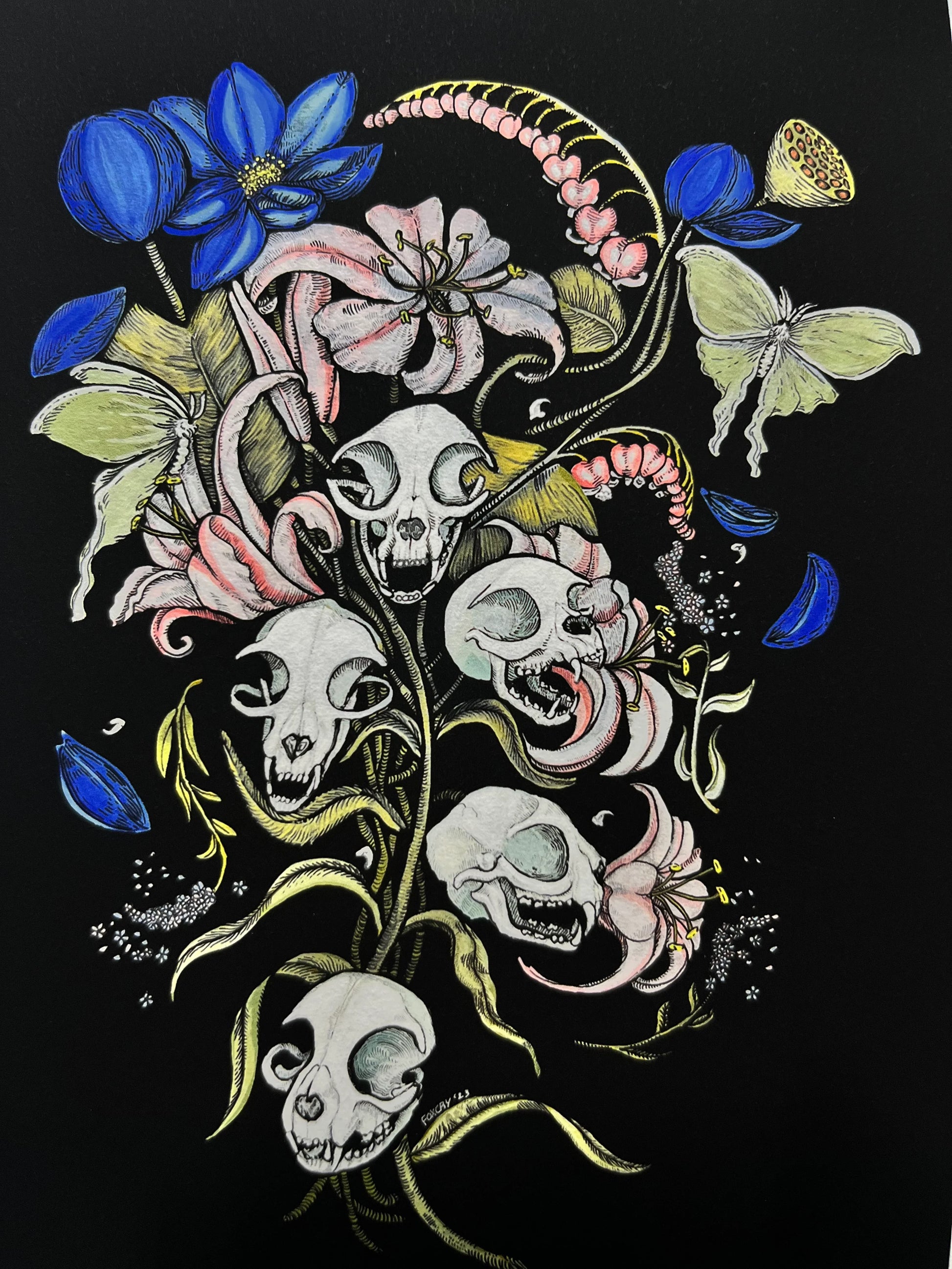 Stargazer lily, forget me not, blue lotus, and bleeding heart. Five kitten skills follow the stem of the lilies. This piece recalls an event in the artists life, when five kittens were recovered on their property. All alive and struggling to stay fed, Everett reflected on how the kittens must kill their own house-cat innocence to be able to survive in the chilly autumn wild. Stargazer lily symbolizes the mourning of the naïveté that must be lost, and the forget me not begs the viewer to remember our own fall from innocence. Bleeding heart speaks for itself, while blue lotus symbolizes a coming into wisdom.