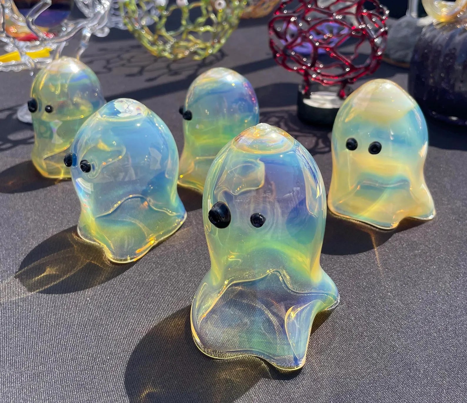 These ghosties are blown and fumed with pure silver for that iridescent glow, and then spun in the air to create the draped look. Each one will be slightly different and one-of-a-kind.