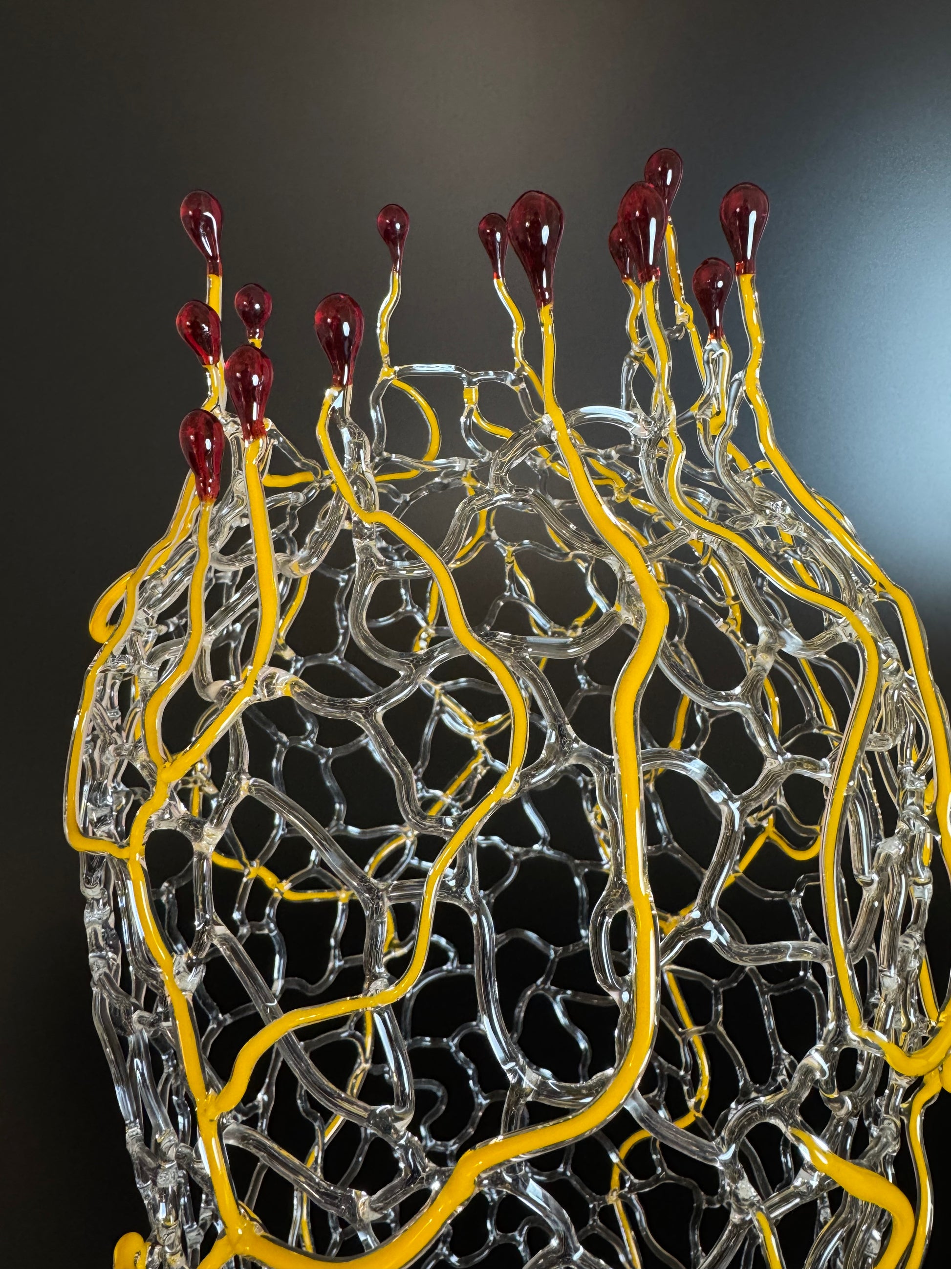 A slime mold plasmodium grows and branches into sporangia over the structure of a vase