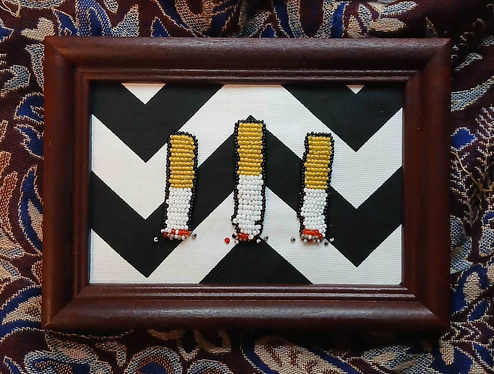 Arpeggio is a self-taught artist in Seattle who creates intricate images using tiny glass beads. Her work mixes themes of portraits, nostalgia, surrealism, and the macabre.