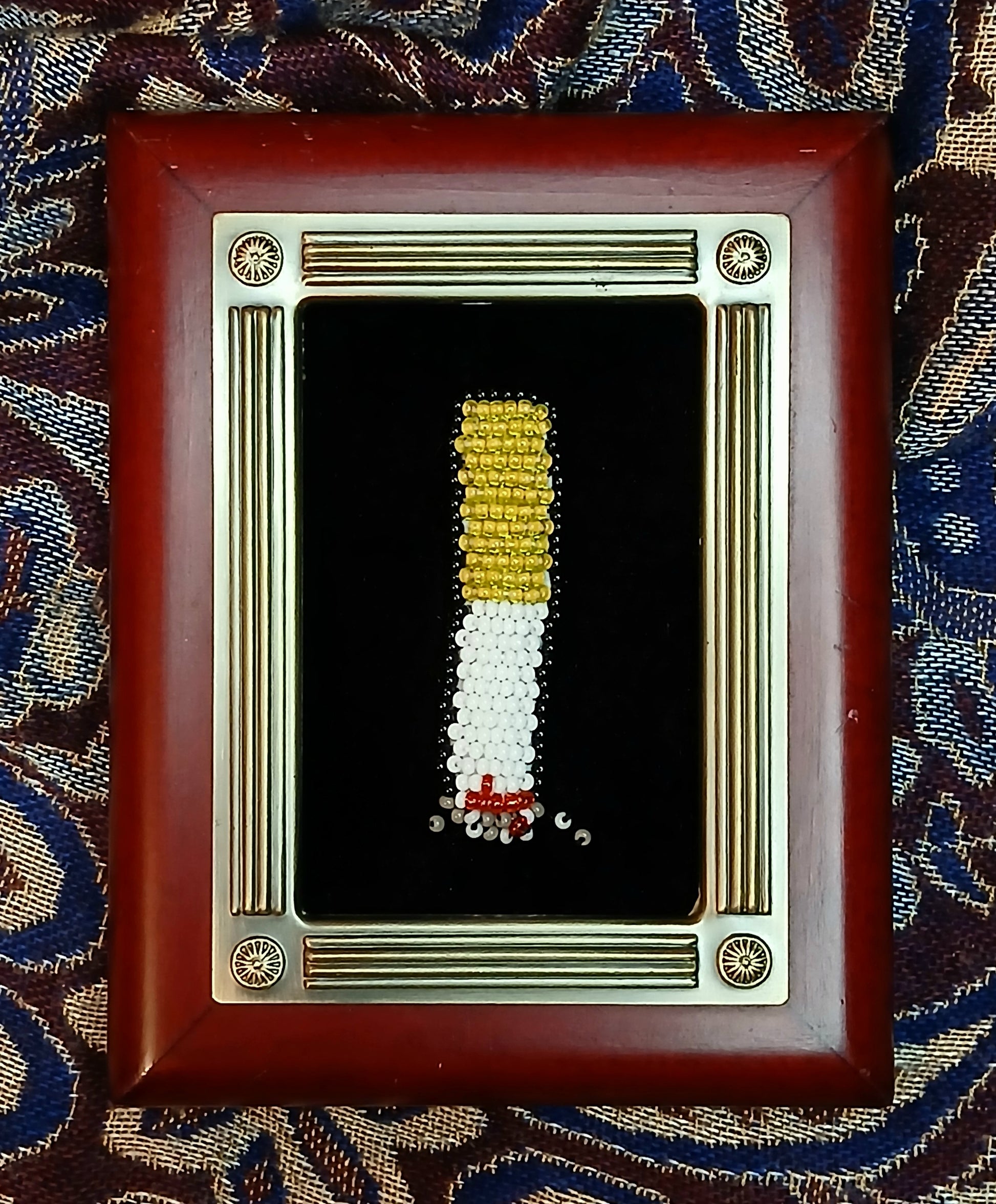 Arpeggio is a self-taught artist in Seattle who creates intricate images using tiny glass beads. Her work mixes themes of portraits, nostalgia, surrealism, and the macabre.