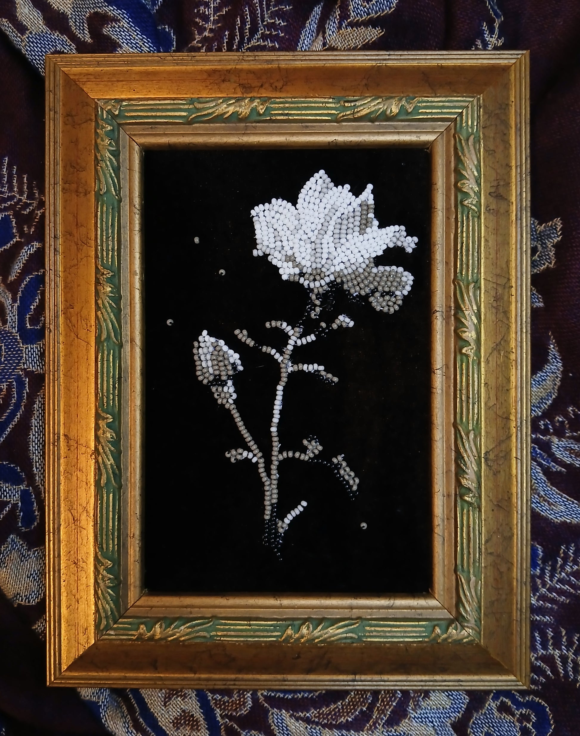 beads, thread, fabric, in vintage frame