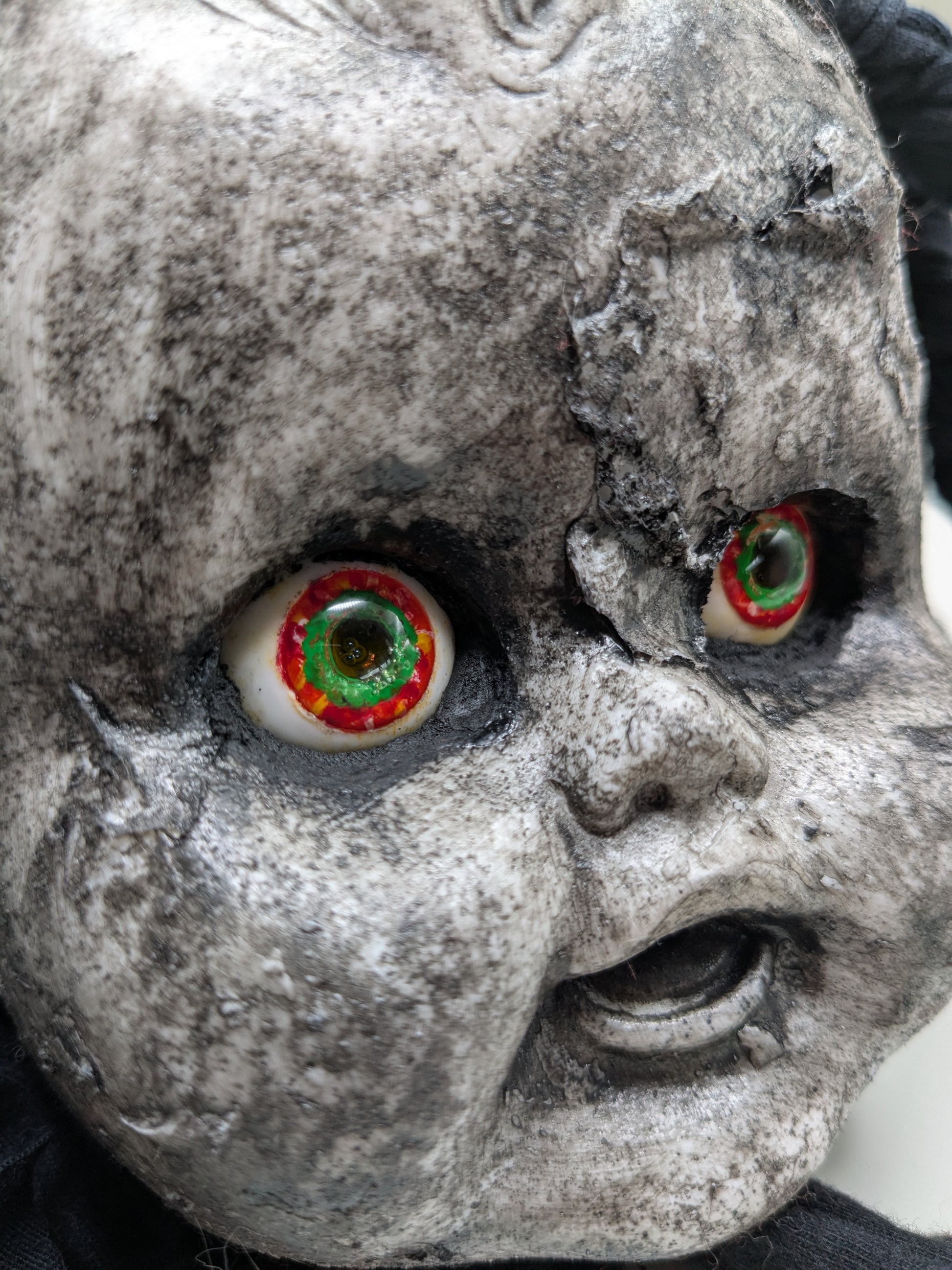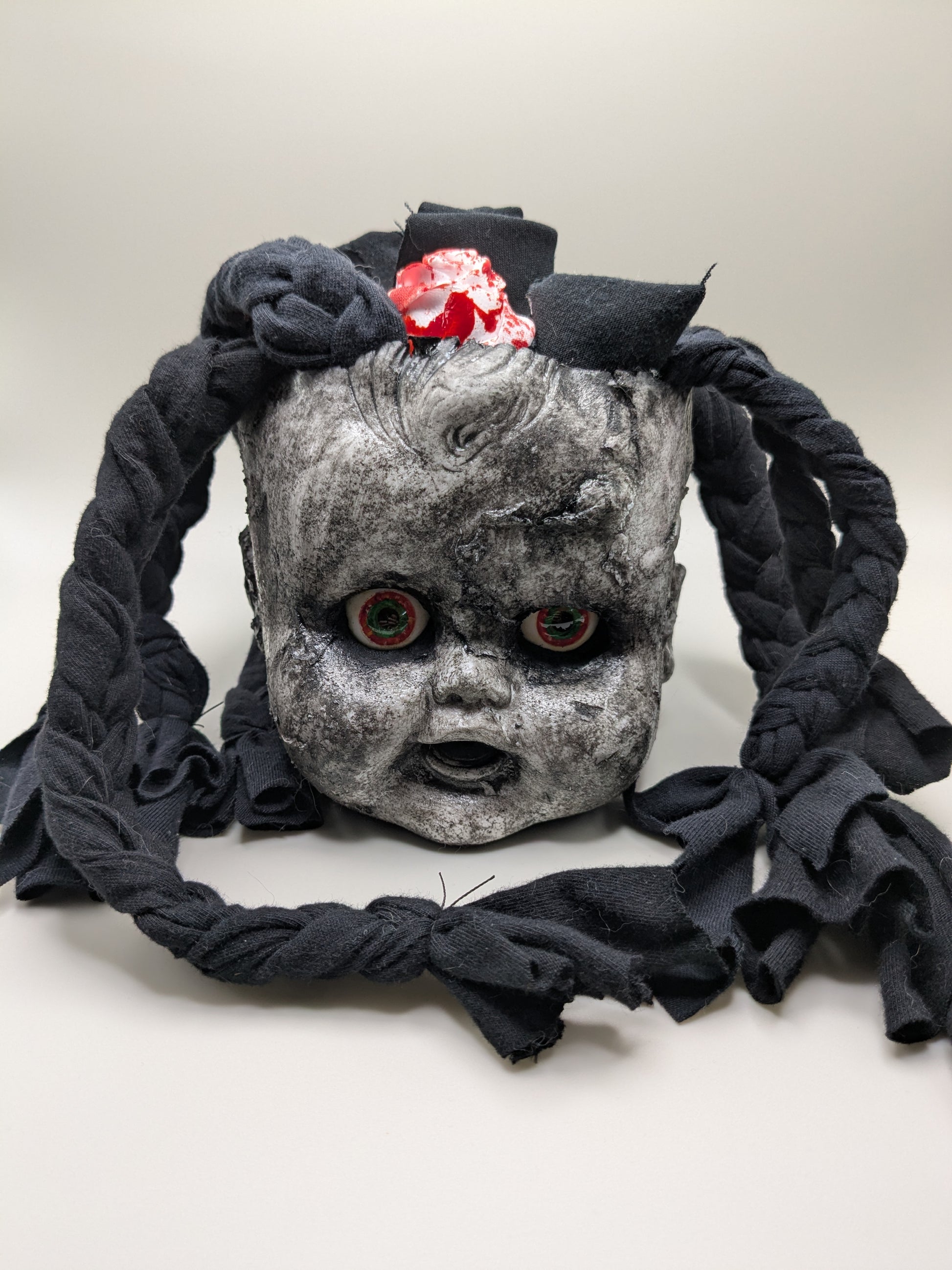 Resin casted vintage doll head with fabric braids, resin eyes