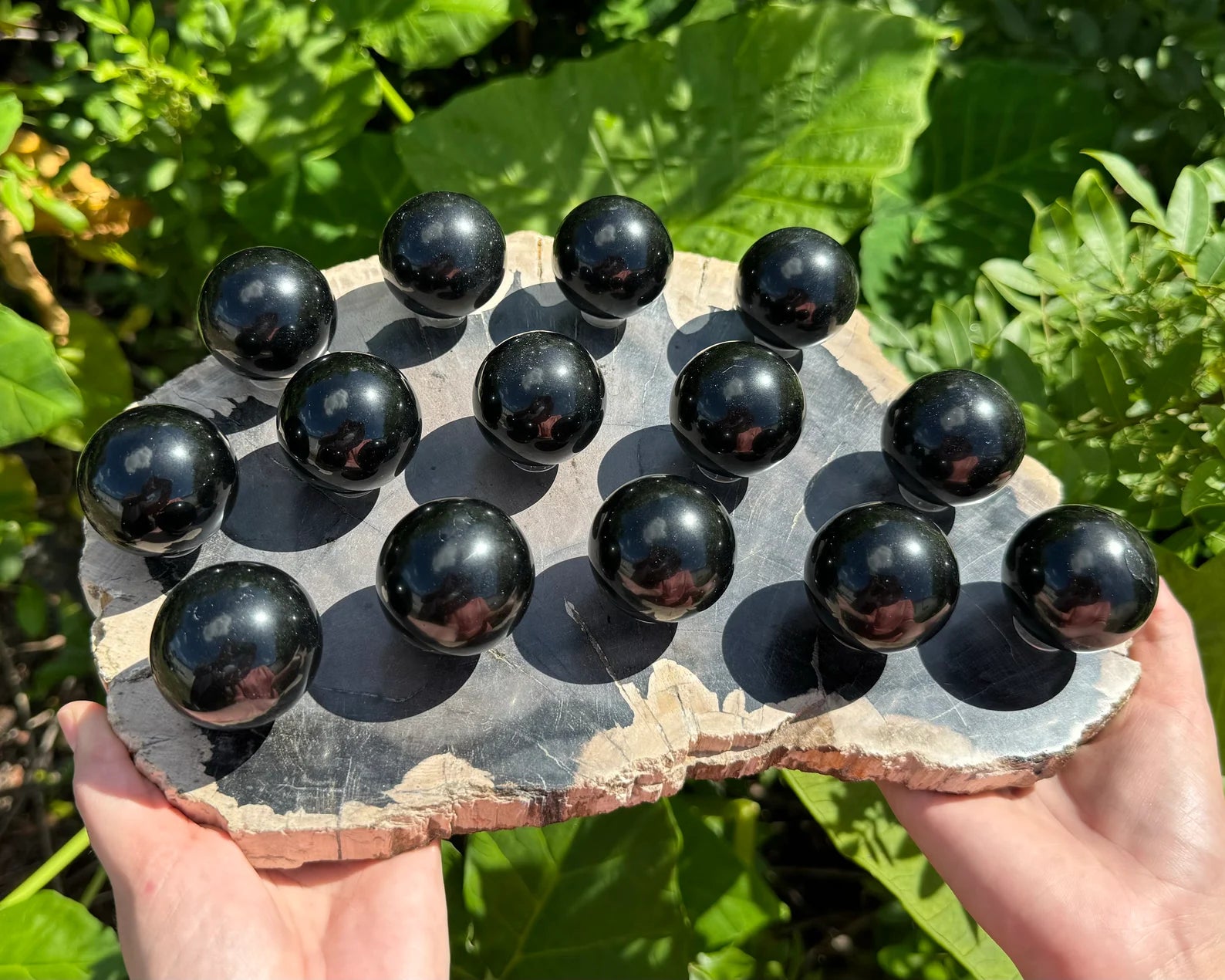 Stunning polished Black Obsidian crystal spheres about 1.5" +/- . Each Sphere comes with a small plastic display stand measuring about 0.25" across.