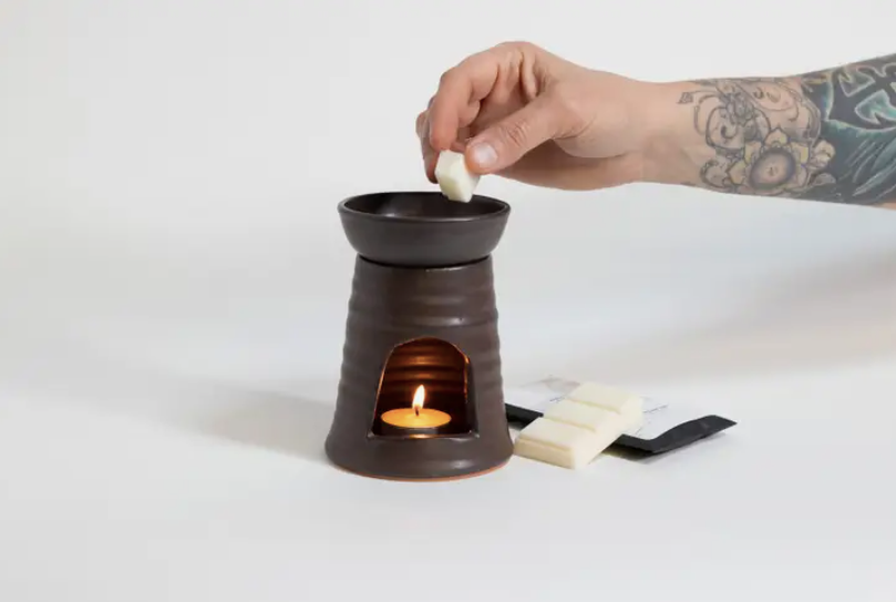 For use with soy wax melts, break off a piece of wax and place it in the top dish. Light the candle beneath and enjoy hours of fragrance.