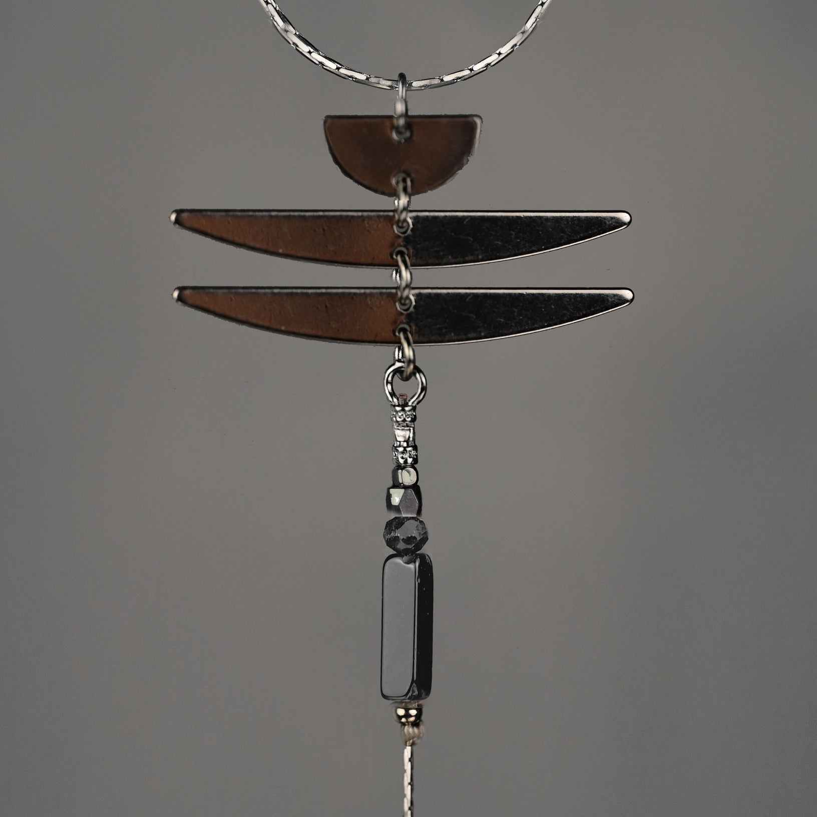 Deco inspired, dark metals combine with beautiful black onyx and black tourmaline stones. Dragonflies symbolize change, transformation, and self realization.