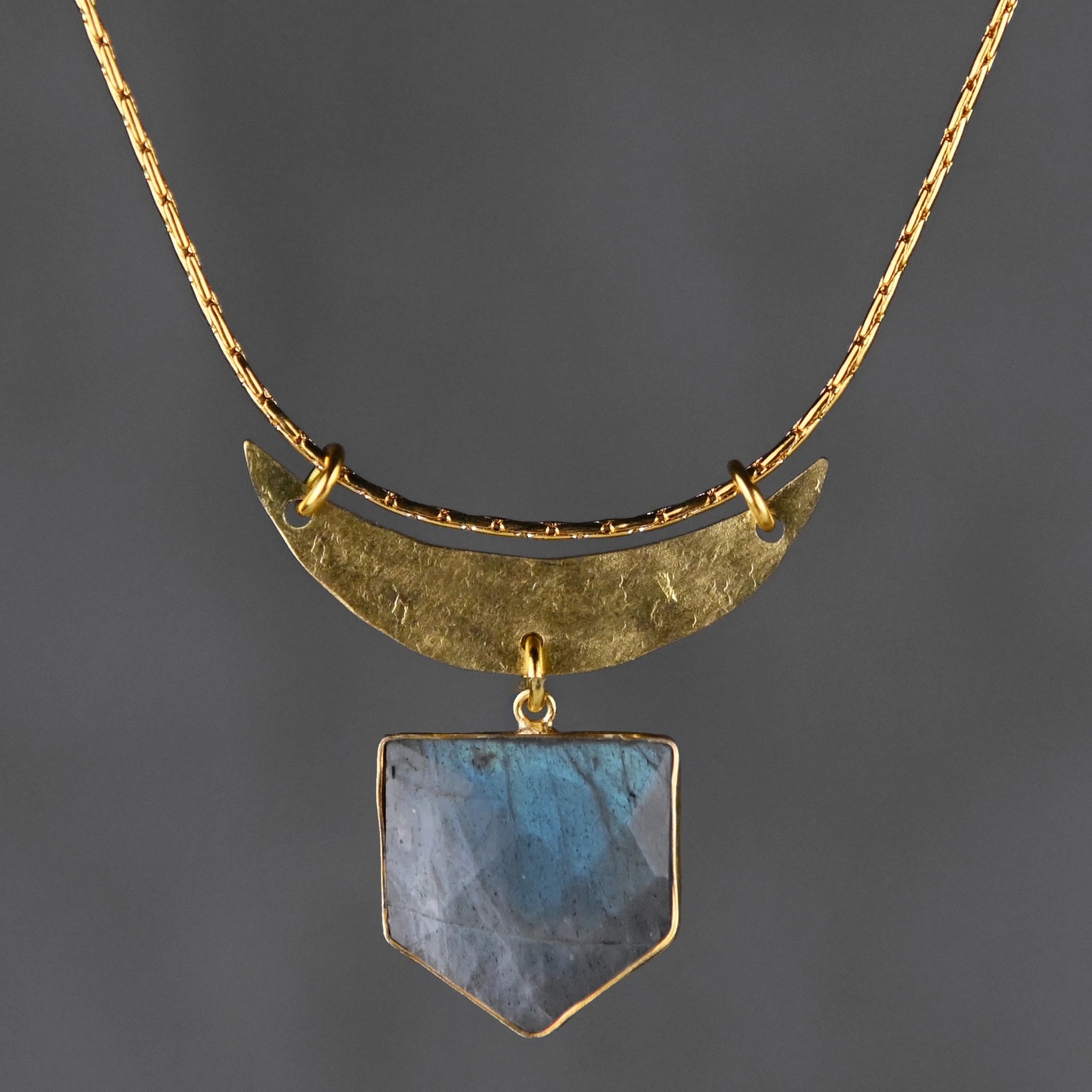 This necklace features your choice of a beautiful Labradorite or Pyrite Stone hanging from a hammered Crescent Moon on faceted brass chain with Gold plating. Wear it alone, or layer it up!!