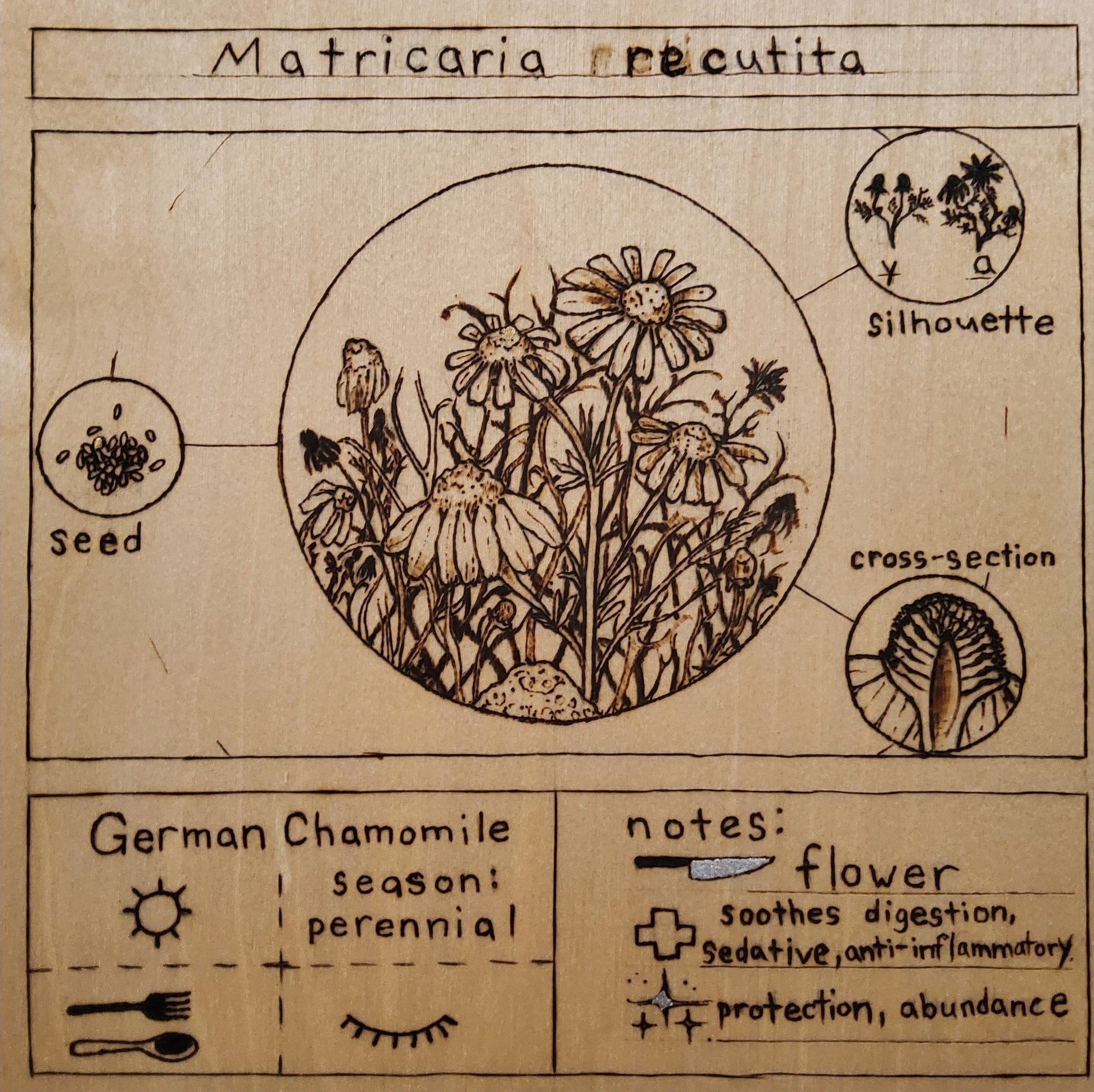 wood panel with pyropgraphy and metal leaf