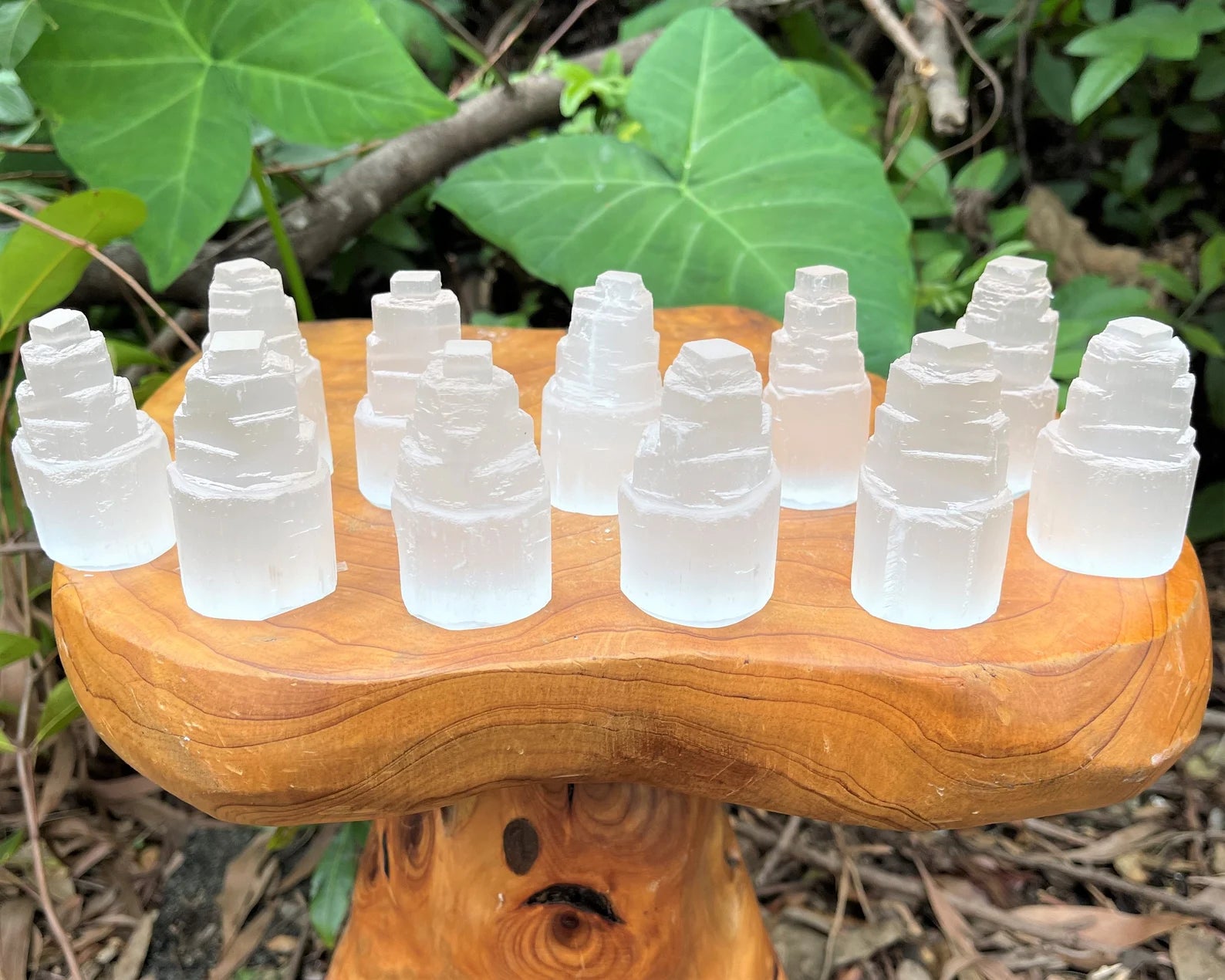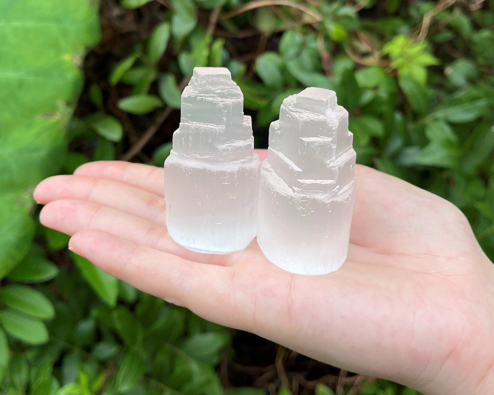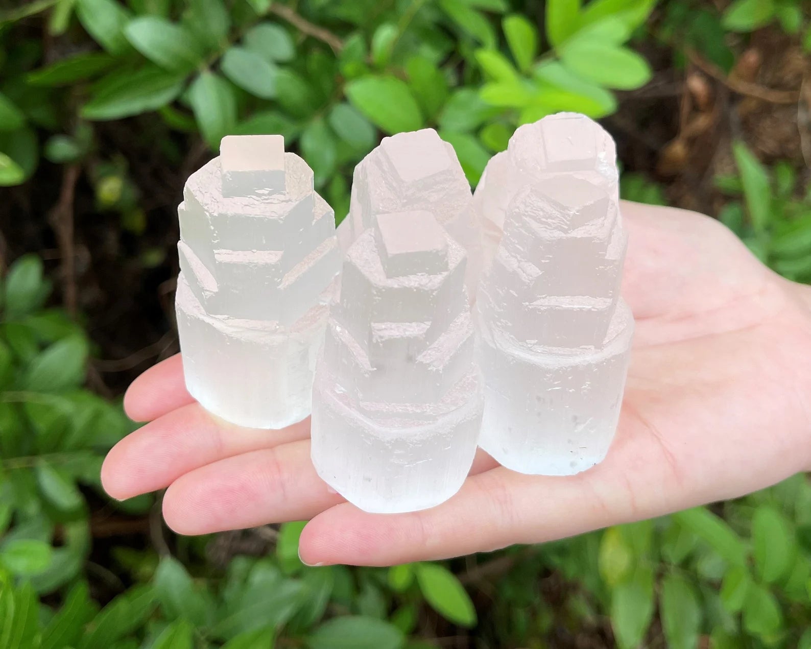 Mini Selenite Towers from Morocco. Also known as Selenite Skyscrapers or Icebergs, each piece is about 2.5" tall +/-. These beautiful calming towers are perfect for meditation or for decoration. Each piece weighs about 2 - 3 ounces, some pieces slightly 'chunkier' whilst others 'thinner'.