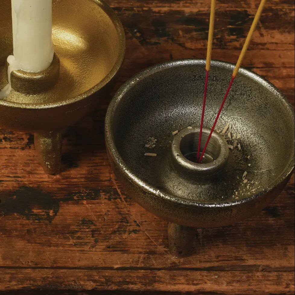 Designed to hold incense sticks, a taper candle, rings & other little trinkets! Cast with a black finish.