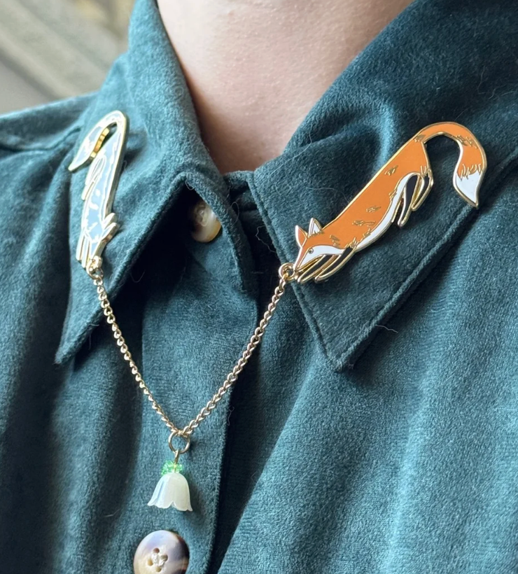 Comes with Silver Fox Pin, Red Fox Pin and a Lily of the Valley charm connector. Chain measures about 4”