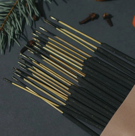 20 sticks in a pack for this premium seasonal incense. Premium Ingredients essential oil blend (cinnamon, clove, fir needle, frankincense, orange, patchouli, peppermint), charcoal, tree resin, bamboo