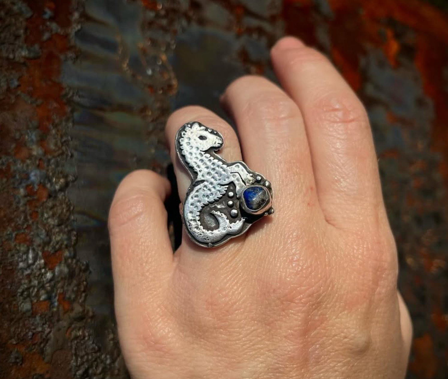 Hippocampus Ring with textured Sterling Silver and Lapis Lazuli