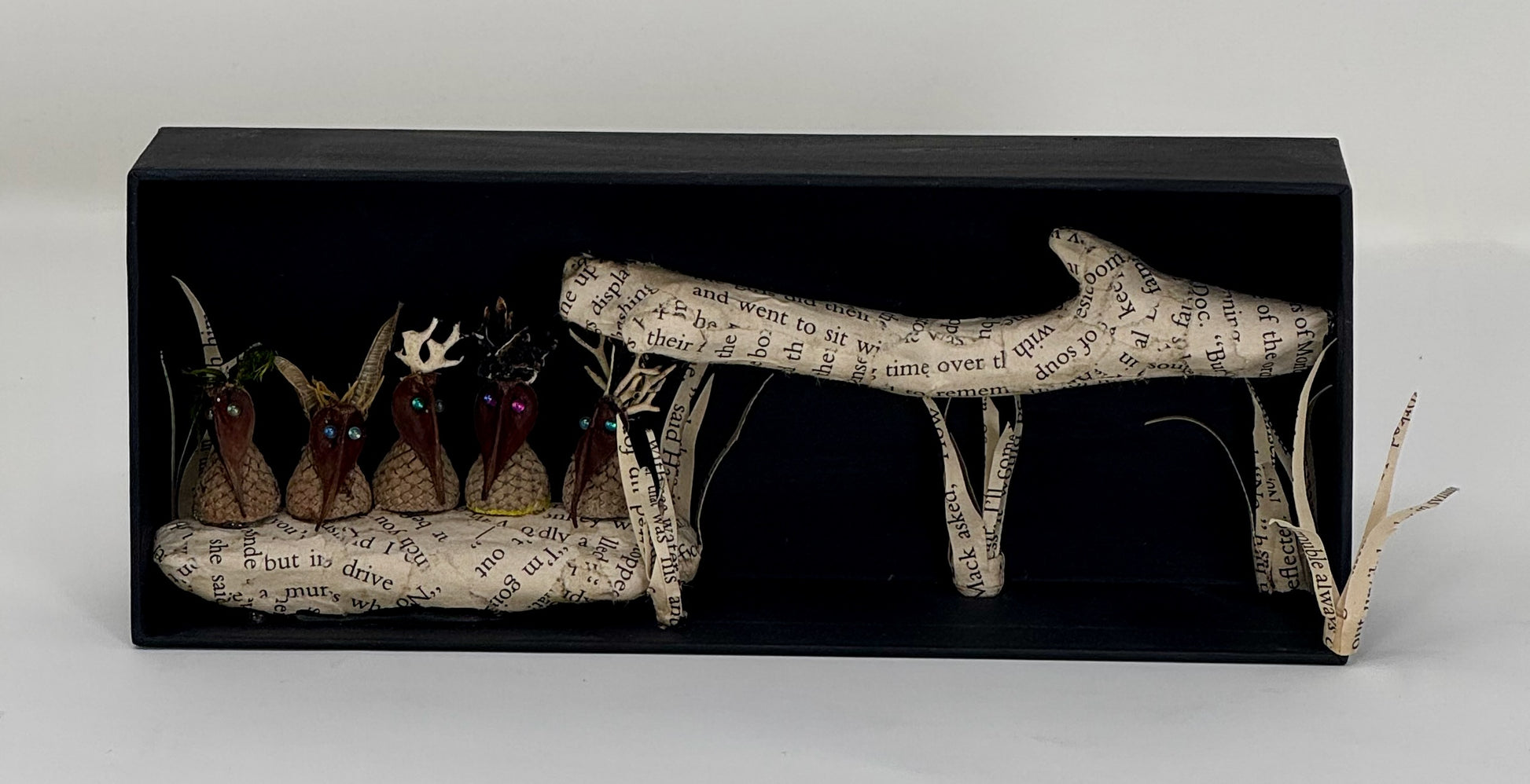 Night Whispers gives physical form to the voices of quiet anxiety. In landscapes of foraged nature and forgotten text, small creatures sculpted from moss, acorns, and seeds stare out, personifying the very whispers that keep us awake.