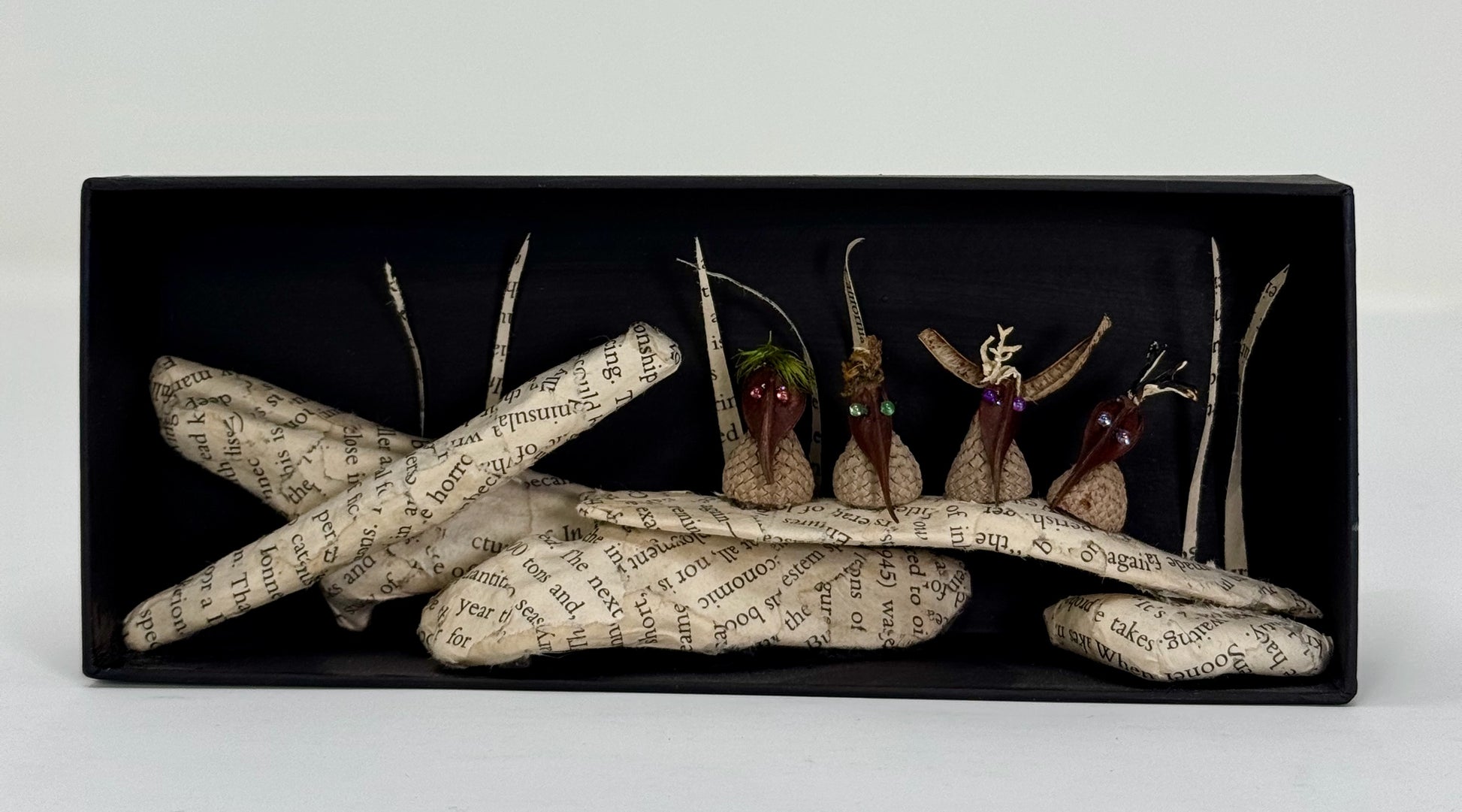 Night Whispers gives physical form to the voices of quiet anxiety. In landscapes of foraged nature and forgotten text, small creatures sculpted from moss, acorns, and seeds stare out, personifying the very whispers that keep us awake.