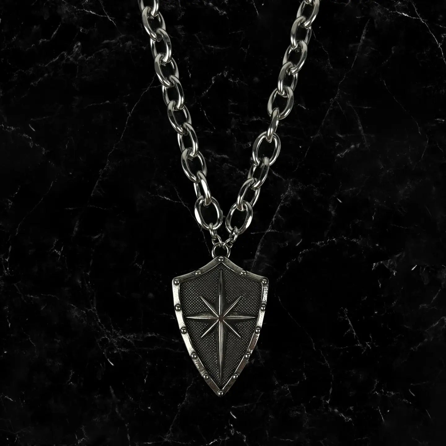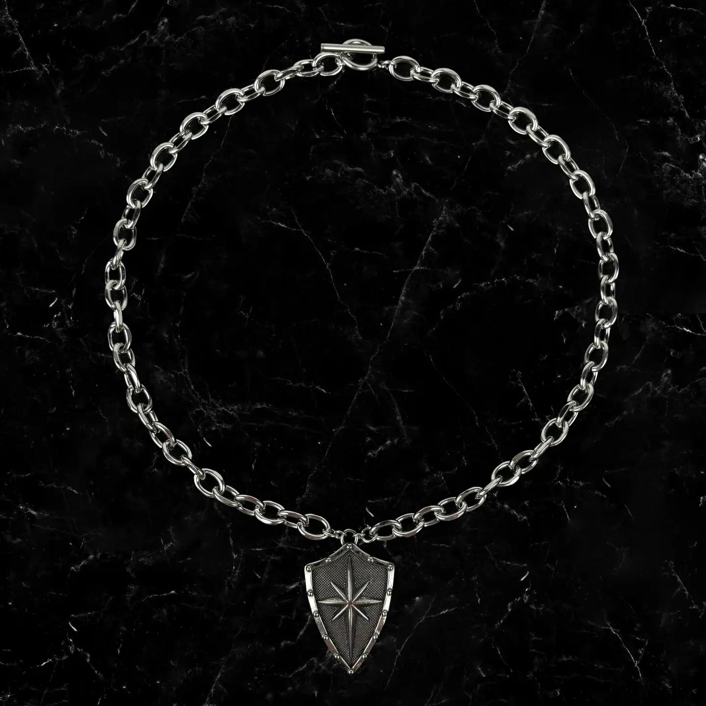 16" steel chain and clasp. pendant measures 1" x 1.5"